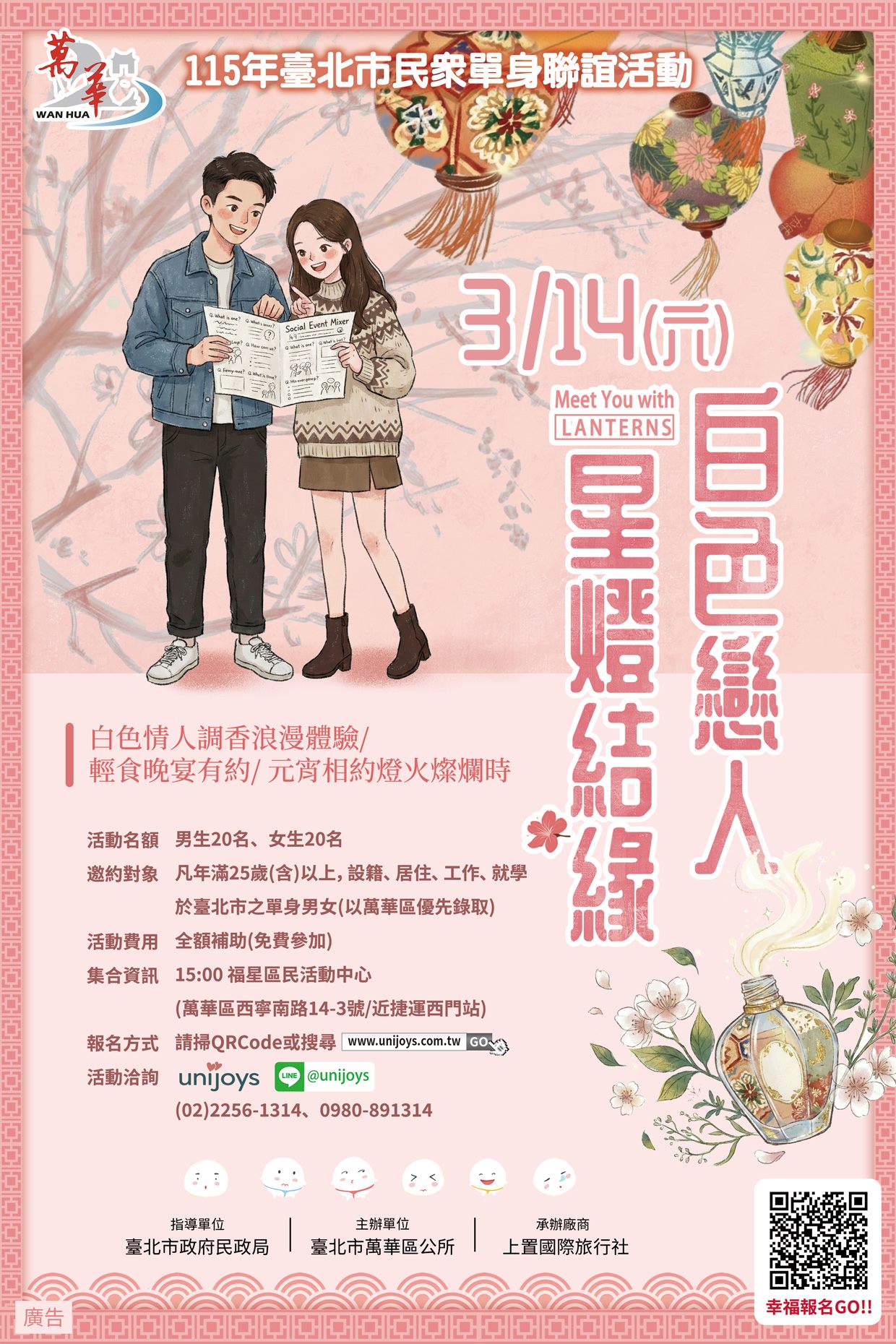 臺北市萬華區公所115年度單身聯誼活動「白色戀人星燈結緣」,將於115年3月14日15時至21時於西門町周邊舉辦, 線上報名時間自1月19日起至114年2月27日或額滿為止,凡年滿25歲以上,在臺北市居住、工作或就學,並且有穩定工作者(以萬華區者優先錄取),總計40個名額,男女各20人,免費參加,活動洽詢(02 2256-1314、0980- 891-314洪小姐或至網站瀏覽查詢。